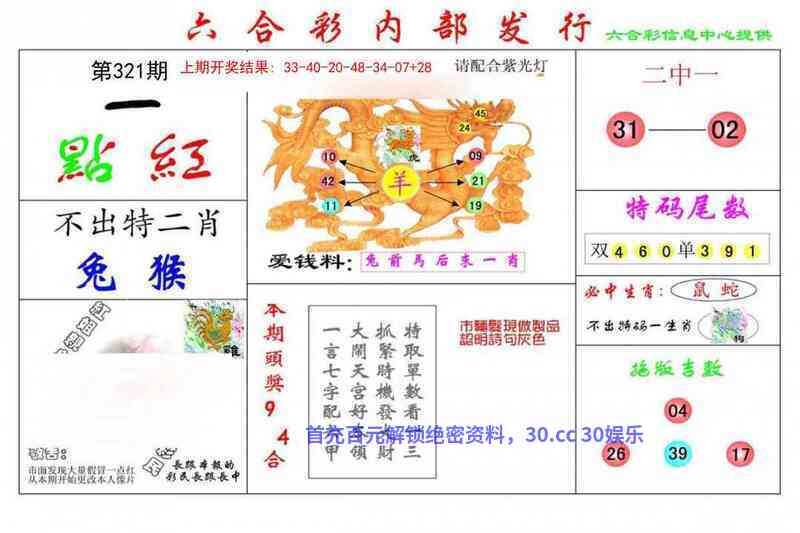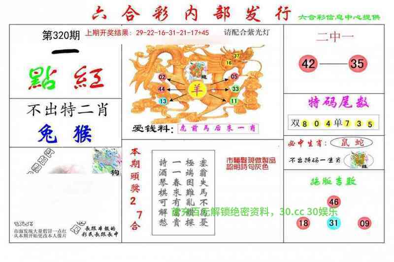 | 321期:天地+二肖〖地肖+马猴〗开:羊23准 |